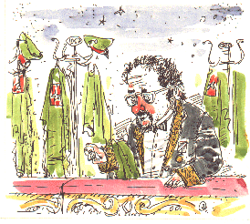Генерал. Смирно! Разговоры с неприятелем прекратить! Итак, начинаем по сигналу... (Ходит по позиции.) Что я вижу? У неприятеля наши секретные снаряды? Измена, понятно. Придется доложить. (Превращается в Премьера.)